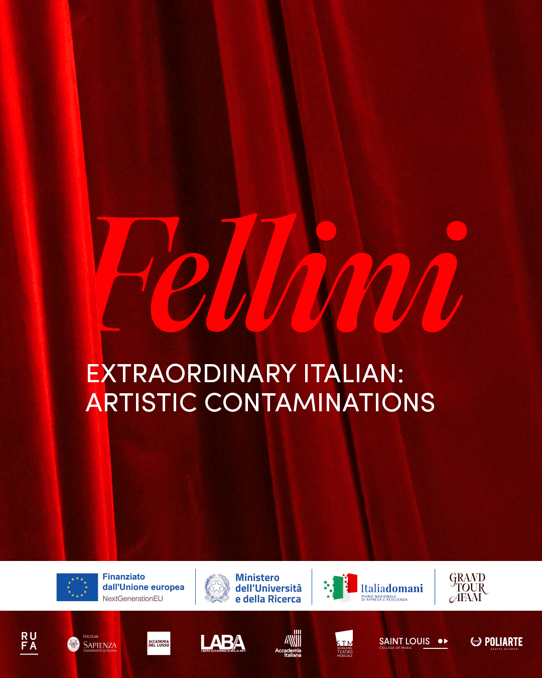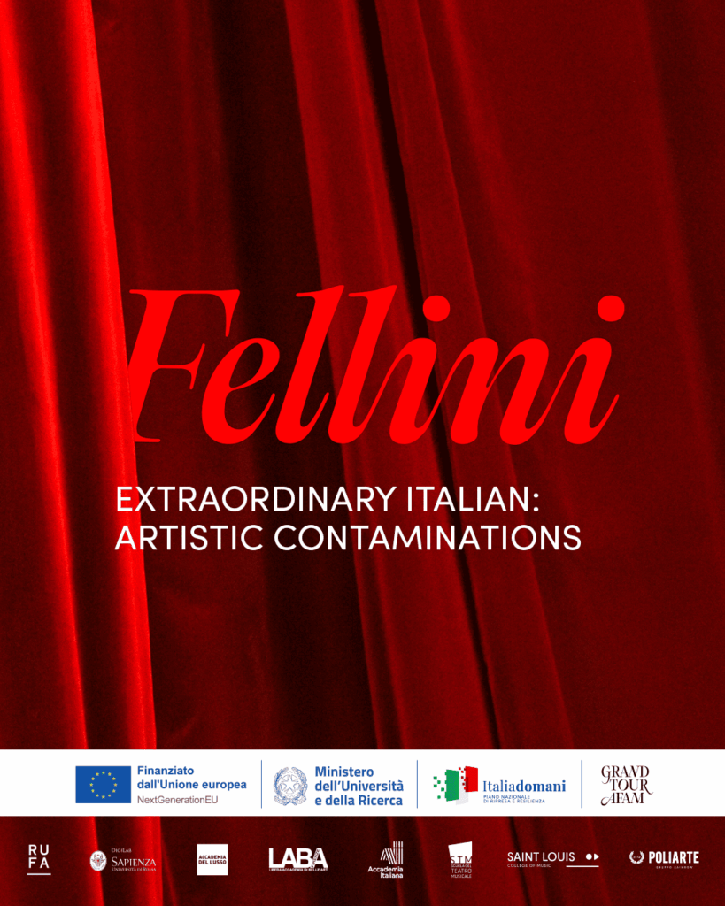 Per questo, il progetto non si configura come una semplice commemorazione, ma come un vero e proprio laboratorio di sperimentazione e ricerca culturale e artistica, volto a creare un dialogo diretto tra l’eredità felliniana e le sensibilità contemporanee. Un’attenzione particolare è stata dedicata alle nuove generazioni di creativi: studenti e studentesse di tre istituzioni d’eccellenza nel campo delle arti visive — RUFA – Rome University of Fine Arts, Poliarte di Ancona e LABA di Firenze.